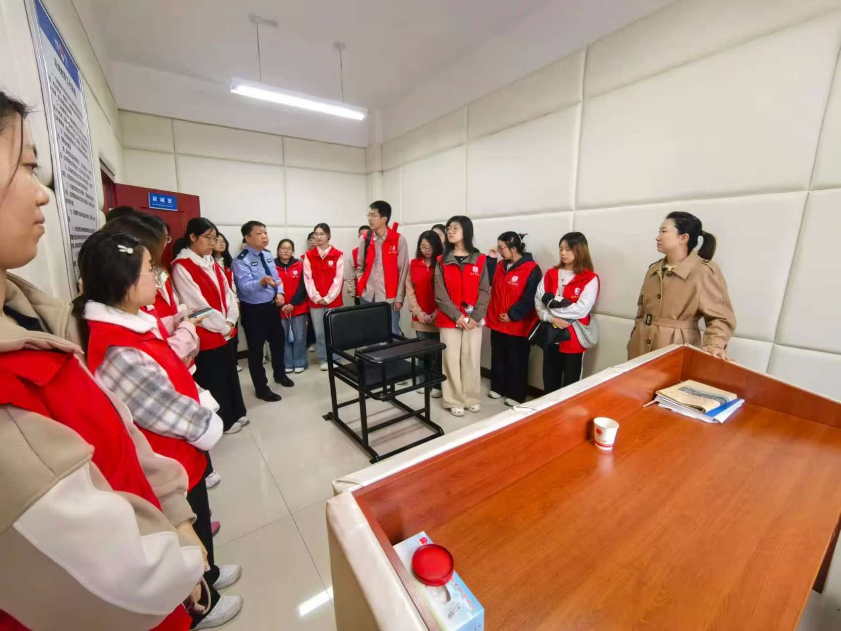 同学们参观训诫室,室内简洁庄重的布置、墙上醒目的法律条文与警示标语,瞬间营造出严肃的氛围。工作人员结合真实的社区矫正案例,介绍了训诫室在社区矫正工作中的作用——这里是对轻微违法人员进行法治教育、行为规范引导的重要场所,通过严肃的训诫谈话,帮助其认识自身行为的违法性,树立敬畏法律、遵守法律的意识。