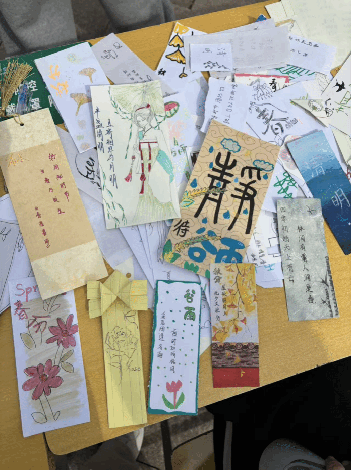 活动现场布置简洁雅致,书签制作区人头攒动,同学们热情高涨。大家选取心仪的节气古诗词,或工整誊写,或精心装饰,将四季流转、节气更迭的诗意凝于方寸之间。五龙校区准备500份材料,本部校区准备200份,现场秩序井然,气氛温馨而热烈。不少同学表示,在书写与创作中不仅重温了经典诗词,也加深了对二十四节气这一非物质文化遗产的理解与热爱。