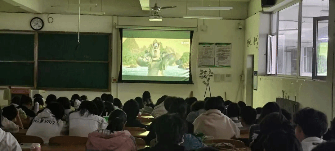 随着播放时间的临近,教室的灯光渐次熄灭,原本喧闹的空间瞬间安静下来。屏幕亮起,熟悉的电影配乐响起,同学们迅速调整状态,目光齐刷刷地投向屏幕,眼神中满是专注与好奇。
