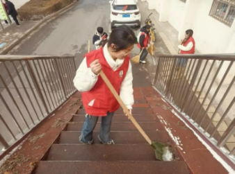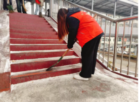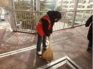 清晨八点半,志愿者领队带着除冰铲、扫把等工具来到现场。志愿者们齐心协力,为师生们开辟出一条安全的通道,用实际行动为他们做实事。尽管天气寒冷,但大家热情高涨,干劲十足,经过几个小时的努力,天桥内的主要道路和公共场所的积雪被清理干净。