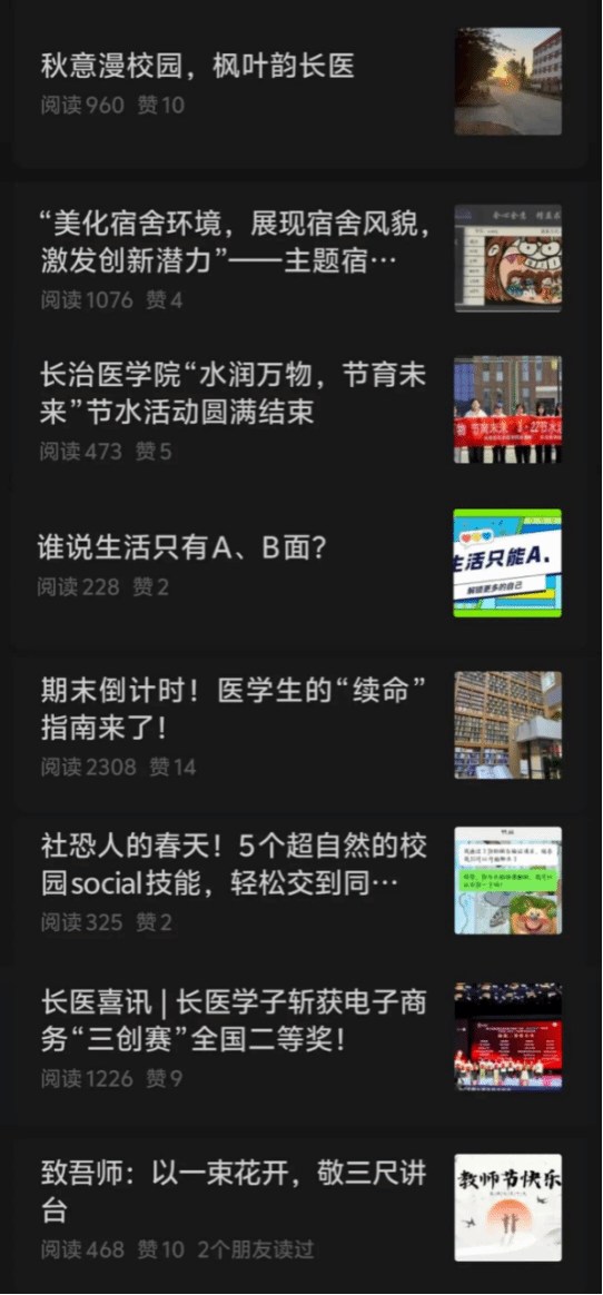 自媒体中心是校园资讯的活力前沿,是学生和社会了解学校的重要窗口,更是同学们学习锻炼的优质平台。部门精心运营长治医学院团委及学生会的公众号等新媒体平台,主要负责开展“教师节”“世界水日”等活动,同时对其他部门各项大型活动和晚会的新媒体宣传活动制作相关宣传图文、宣传视频、海报等。