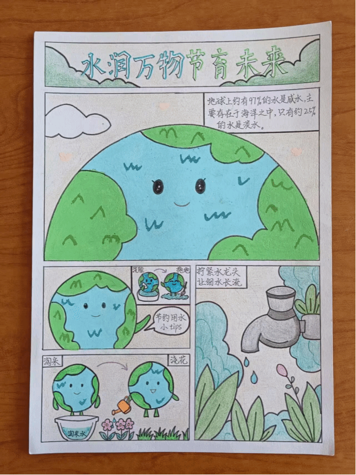 本次活动中,绘画与海报作品亮点频出。同学们积极参与,创作了大量紧扣“水润万物,节育未来”主题的作品。海报设计兼具创意与内涵,融入学校特色元素,以清晰精美的画质(不低于1080p ,4K尺寸)传递节水信息。绘画作品形式多样,手抄报、连环画等风格各异,色彩斑斓的画面展现出同学们对节水的深刻理解,用艺术笔触描绘出保护水资源的美好愿景。